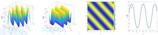 If we choose ,  and , and , where k1, l1 and ω1 are nonzero constants, we can obtain the periodic wave structure of the (2+1)-dimensional Klein–Gordon equation shown in Figure 1. This is a common wave structure that undergoes periodic changes with the phase space (x, y, t). Although Equation (39) is a novel periodic wave solution of the (2+1)-dimensional Klein–Gordon equation, the wave structure is similar to the periodic wave structure in ref. [].