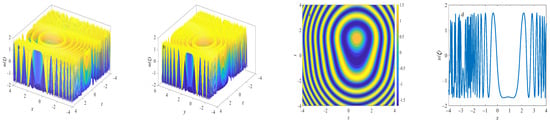 If we choose , , , and , we can obtain the new type of complex wave structure of the (2+1)-dimensional Klein–Gordon equation shown in Figure 8. This is a nonlinear wave propagating along the x-direction, which is a quasi-periodic nonlinear wave with gradually changing periods due to the exponential increase in the value of .