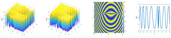 If we choose , , , and , we can obtain the new type of complex wave structure of the (2+1)-dimensional Klein–Gordon equation shown in Figure 2. This is a nonlinear wave propagating along the x or y direction in two-dimensional space under certain conditions. The center of the (x, t, u) or (y, t, u) contour is an approximately circular wave structure, and many harmonic waves will appear as time increases or decreases.