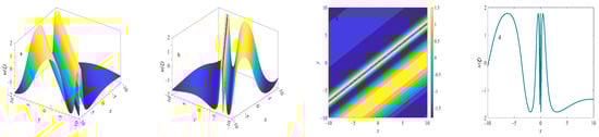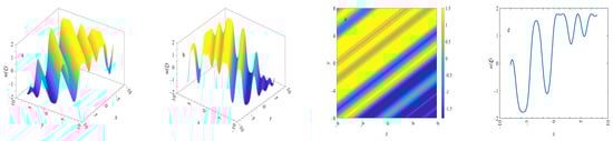 In Equation (58), if  is not introduced, Equation (59) can only have traveling wave solutions. The traveling wave solutions commonly used in solving the Klein–Gordon equation in the literature were mentioned above. The introduction of  makes Equation (59) have complex wave solutions. So, we can construct various nonlinear waves of the (2+1)-dimensional Klein–Gordon equation by selecting different values for , , and h that can meet Equations (56) and (59). In the following section, we will provide several nonlinear wave examples.