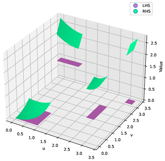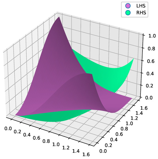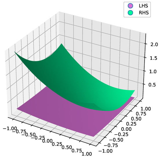 In the context of the complete b-metric space , where , , and the mapping is defined as , several observations can be made. Firstly, it is evident that S is an asymptotically regular continuous mapping on . Moreover, it possesses a unique fixed point at zero. However, despite these properties, it does not satisfy the condition expressed by (2) for all (Figure 2). It is notable that even when considering the supremum of permissible values for parameters, with and , the mapping fails to fulfill (2).