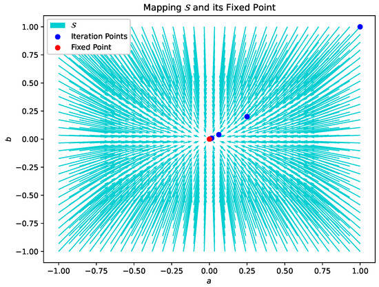 Let be a b-metric space where , for all Here, the quasi-index is Consider the mapping given by and It is immediate that is an asymptotically regular mapping. If both or then In this case, (2) holds for the aforementioned values of the parameters M and K. Now, consider and ; thus, (2) holds for any non-negative and We verify this example with Figure 1, which shows the behavior of the self-mapping on .