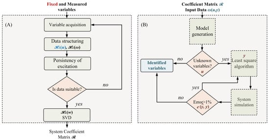 Block diagram of the data-driven parameter identification algorithm. (A) Data acquisition and processing; identification of the matrix. (B) Identification, validation, and estimation of unknown system variables.