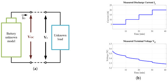 Consider the system shown in Figure 3a, which comprises a battery and an unknown load. The parameters of interest to obtain a state-space system representation are, in this case, the open-circuit voltage , terminal voltage , and discharge current .