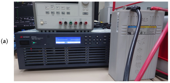 To validate the models obtained in the previous section, three different scenarios were proposed. The first test scenario was conducted under various SoC conditions to verify that the identification of the coefficient matrix is not affected by the lack of information of . The second test is performed under the condition of full discharge at constant current. The third scenario involves a full discharge condition with step-like transitions in the discharge current. These scenarios are executed with the identified model (38), and performing the estimation of . All discharge processes were carried out using the Keysight RP7971A battery emulator, shown in Figure 4a.