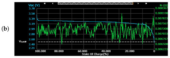 Figure 6a shows the comparison between the measured and estimated OCV at a constant discharge current of 25 A. The data for the OCV were acquired using the Keysight battery emulator. Figure 6b presents the measured and estimated waveforms for ; and Figure 6c shows the SoC versus OCV plot. The SoC presented in Figure 6 was computed from the discharge current and adjusted through a polynomial fitting based on the estimated .