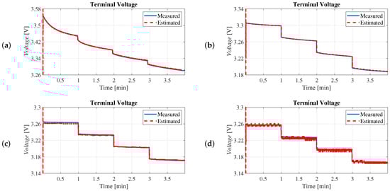To validate the model (29), subject to an unknown (one of the input variables), the measured battery terminal voltage at different SoCs is compared with the corresponding variable generated by the model. This comparison is shown in Figure 5. During this test scenario, the data were acquired over a period of 4 min, with stepped transitions in the discharge current of , 5, , and 10 A, and for different SoCs of , , , and .
