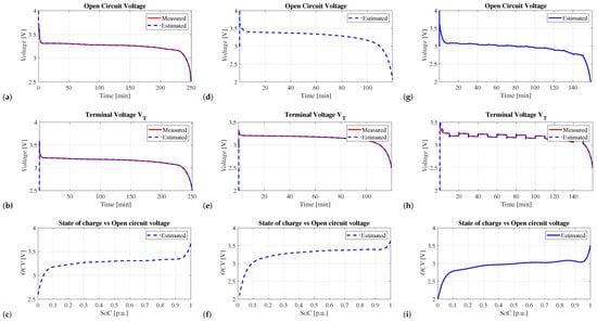 (From top to bottom) Time responses of , , and the response of SoC against OCV, for constant discharge currents of 25 A (a–c) and 50 A (d–f), and a step-like current fluctuating between 25 A and 50 A (g–i).
