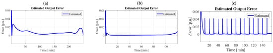 Figure 7 presents a graph of the error between the measured and estimated value of . This error is critical because, in the absence of the actual OCV measurement, a small value in the error indicates that the calculated OCV is close to the real one. This idea is supported by the fact that the generated output parameter includes both the OCV and the hidden state of the system.