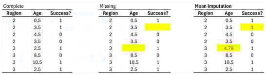 Imputation is a common strategy for dealing with missing data. It fills in the blanks with an appropriate value to create a “completed” dataset that can be analyzed using traditional statistical procedures. The most direct and intuitive strategy for continuous variables is to replace missing observations with the mean of the observed sections, known as mean imputation, see [14]. Similarly, unobserved categorical and ordinal variables could be substituted by the mode of the observed ones (mode imputation). However, because this method does not take into account association across variables [15,16], it also produces biased and over-fitting results [17]. In Figure 1, we show how to perform a mean imputation. The variable Region represents the region of a car accident, the variable Age represents the age of the car involved, and the variable Success? represents whether the airbags of the car function properly.