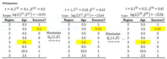 The expectation maximization (EM) imputation is a type of single imputation technique using the EM algorithm, and it is extensively studied by various literature [5,18]. Refs. [19,20] also consider using EM for the masked causes of one-shot devices. The EM algorithm is an iterative procedure of expectation (E-steps) and maximization steps (M-steps). In one iteration, the expected values of the missing responses or covariates would be updated as the mean conditional on the observed covariates, such as the components’ manufacturer and current stress levels (E-step). The complete data formulas will then be applied to the dataset with missing data filled from the E-step to obtain the updated estimates by maximizing the complete likelihood function (M-step). The E-step and M-step will be performed iteratively until the imputed values converge. To illustrate how EM imputation works, we use the data example in Figure 1. We assume the follows the exponential distribution with rate = and the probability of Success, , given the of the car is