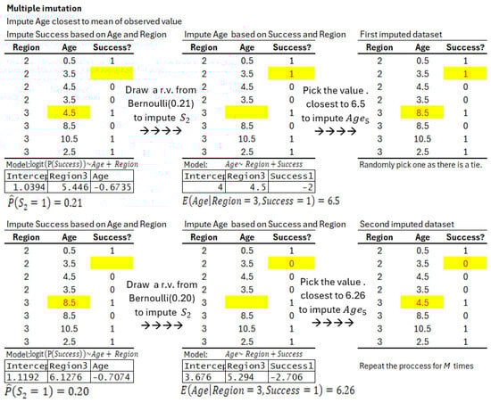 Multiple imputations have been considered as a gold standard to account for missing data, and more specifically, the fully conditional specification (FCS) method (also labeled the multiple imputations by chained equations (MICE) algorithm) [21]. The multiple imputations by FCS impute multivariate missing data on a variable-by-variable basis, which is particularly useful for studies with large datasets and complex data structures, see [22]. It requires a specification of an imputation model for each incomplete variable and iteratively creates imputations per variable [23]. Compared to a single imputation, MI replaces each missing value with multiple plausible values, allowing uncertainty about the missing data to be considered. MI consists of two stages. The first stage involves creating multiple imputed datasets. In practice, we can first apply Box-Cox transformation on the numerical covariates such that they follow a multivariate normal distribution approximately. The MI method imputes the missing responses or the covariates stochastically based on the distribution of the observed data. We will repeat the process five to ten times to create ten imputed datasets. Once again, we use the data example in Figure 1 to show how multiple imputation works. We assume the variable Age has a linear relationship with the variables Region and Success and the log-odds of Success are linearly related to the variables Region and Age. We first impute the missing data with the average of observed values. Then, we form a regression model on the variable under imputation and predict the missing value with the model. If the variable is numerical, we often use the predictive mean matching method, which imputes the missing entries with the closest observed values to the predictions. For binary variables, we can perform a logistic regression and draw Bernoulli random variables with the predicted probabilities to impute the missing variables. Figure 3 shows how multiple imputation works step by step. For brevity reasons, we do not consider the model coefficient uncertainty in this example.