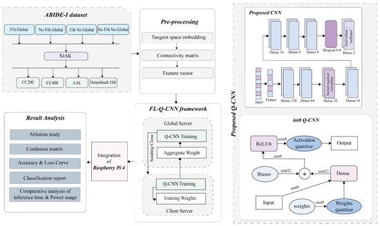 In recent years, machine learning, deep learning, and multi-feature based network-based techniques have shown promise in the medical field, processing large, complex datasets to identify patterns that may not be discernible through traditional analysis and achieving acknowledgment by the trained specialists in diagnostics tasks [8,9,10,11]. Specifically, Convolutional Neural Networks (CNNs) have been employed to analyze fMRI data, offering a powerful tool for detecting ASD-related neural patterns [7,12]. Furthermore, Quantized CNNs (Q-CNNs) have been introduced in various recognition tasks [13,14] to make the models more lightweight and sustainable. This study introduces an automated approach utilizing the ABIDE-1 dataset and int8 quantized 1D CNN model to detect ASD from fMRI data (See Figure 1). The NeuroImaging Analysis Kit (NIAK) pipeline is employed using the Craddock 200 (CC200), Craddock 400 (CC400), Automated Anatomical Labeling (AAL), Dosenbach160 brain atlases, and four different filtering methods, namely filt-global, filt-noglobal, nofilt-global, and nofilt-noglobal. Before the model training process, the Regions of Interest (ROIs) of each atlas are converted to feature vectors utilizing the tangent space embedding. This study proposes a novel 1D-CNN model equipped with an input layer, flatten layer, eight dense layers, and a dropout layer. Furthermore, the CNN model is quantized by utilizing Quantize Aware Training (QAT) to reduce the execution time, power usage, and storage consumption. The proposed Q-CNN model utilizes int8 quantization; therefore, the model is very lightweight and efficient to deploy on any edge devices. The int8 quantization is performed to reduce the dependency on high-end systems for classification tasks. This method was chosen because it strikes an optimal balance between reducing model size and computational load while maintaining a high level of accuracy. Compared to other quantization methods, int8 quantization significantly decreases the memory footprint and power consumption, which is especially important for deployment on resource-constrained devices like the Raspberry Pi. Additionally, int8 quantization is widely supported by hardware accelerators, further making it a practical choice for efficient inference on edge devices, where computational resources are limited. As the motivation is for this model to be used effectively in real-world environments, the need for a privacy preservation system for the healthcare center is a primary concern. To address the issue, a federated learning (FL)-based training framework is introduced to maintain the privacy of the data centers, where their provided dataset will be trained in each data center’s or hospital’s local machine (considered as a client server) while keeping the datasets decentralized. For the FL training, we have 10 clients splitting the overall dataset into two parts for each client. The iterative training process of the FL framework may be particularly effective for the imbalance dataset as the classes are trained locally in multiple different local machines and the training weights are aggregated in a global server. There is a chance that if any class is left under-trained in any client server that the training may be perfectly performed in another client server. Therefore, the overall global server’s weight aggregation process is not compromised. As a result, by introducing an FL-based Q-CNN model, this study provides an efficient framework for the ASD classification task. This study explores the optimal atlases for ASD classification utilizing all the filtering methods within the NIAK pipeline. The Q-CNN model’s training and testing are conducted separately for each of the filtering methods with four atlases.