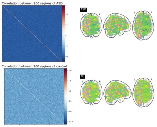 After the ROIs are extracted, the final stage is to convert them into a functional connectivity matrix, which is also referred to as a functional connectome. This matrix is represented by the dimensions . The brain atlas determines the associations between specific regions of interest in the brain, which are measured by the functional connectome, a comprehensive representation. The essential data pertinent to the correlation of Blood Oxygen Level-Dependent (BOLD) signal time series between each pair of ROIs are the fundamental purpose of a functional connectivity matrix, as defined by a specific brain atlas. The method is implemented on an individual basis for each participant. To develop functional connectomes, an intricate methodology was implemented. Utilizing the default Ledoit–Wolf regularized covariance estimator [34] necessitated the implementation of a tangent-embedded parametrization technique. To robustly characterize replicable connection patterns at the group level, the tangent space embedding method efficiently employs both partial correlations and correlations. In addition, it effectively depicts individual connections as deviations from the group’s average, thereby facilitating the identification of subtle differences at the individual level. The embedded connectome in Figure 2 illustrates the functional connectivity matrices, which demonstrate the complex connections between various brain regions. A representative group of individuals diagnosed with autism spectrum disorder and a control group are effectively represented in the graphic that is presented, which illustrates the substantial differences in functional connectivity observed in various brain regions. In every cell of the correlation matrix or connectome, the correlation coefficient is present, which quantifies the magnitude of a linear relationship between two regions. From −1 to 1 is the range of the correlation coefficient. When the correlation coefficient is 1, a perfect positive linear relationship is observed. Conversely, a correlation coefficient of −1 indicates a complete negative linear association, which means that when one region experiences an increase, the other region experiences a corresponding decline. The absence of a linear relationship between the variables is demonstrated by a correlation coefficient of 0.