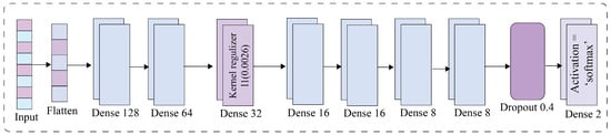 The proposed CNN architecture includes an input layer followed by a flatten layer, where the 1D feature vectors are flattened and pass through seven dense layers with the sizes of 128, 64, 32, 16, 16, 8, and 8. A kernel regularizer of 0.0026 is incorporated in the dense layer with a filter value 32. Each dense layer consists of a Rectified Linear Unit (ReLU) activation function. A dropout layer of 0.4 is used to drop a certain percentage of neurons during training, reducing the risk of overfitting. In the final dense layer, to convert the overall output into probability scores, the SoftMax activation function is used. Let us consider a hidden layer of h, where each neuron of the hidden layer receives an input and bias value of and , respectively. The connection between two subsequent hidden layers of h and is connected through the weight vector . After the connection, the hidden layer is activated using Equation (5).