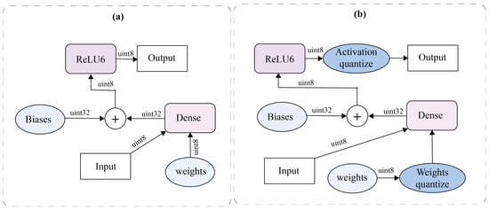 Algorithm 1 outlines the quantization training process, as illustrated in Figure 4. The process begins with the model accepting an input feature vector X and its corresponding labels y. The CNN-based architecture, initially designed for floating-point inference, is utilized to predict outputs from the input feature vectors, as depicted in Figure 3. Figure 4 demonstrates the transformation of the dense layer’s pre- (see Figure 4a) and post-quantization (see Figure 4b). As in Equation (9), both input and output are represented as 8-bit integers, using a 32-bit integer accumulator and Figure 4b illustrates the dense layer’s training using simulated quantization. Throughout this process, all variables and computations are executed with 32-bit floating-point arithmetic. To replicate the effects of quantization on variables, weights, and activation functions, quantization endpoints are incorporated into the computational graph. This graph simulates integer-only computation while remaining trainable by standard optimization techniques for floating-point models.
