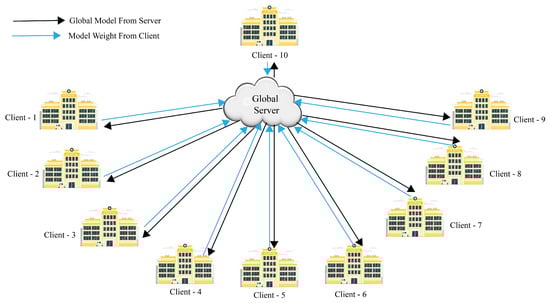 In Figure 5, a global model is sent to the clients. After training the model , the model training weight is sent to the server. The averaging process can be described mathematically by Equation (14).