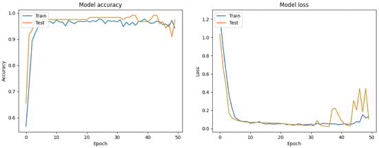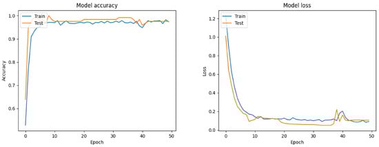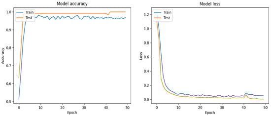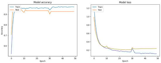 Here, the SoftMax function is defined as and represents the input feature vector. and denote the standard exponential function for the input and output, respectively. The number of classes is represented by n. The categorical cross entropy as the loss function and Adam as the optimizer are used in the proposed model. The categorical cross entropy can be calculated using Equation (8),