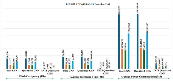 The table presents the performance metrics of three CNN models, Base CNN, Quantized CNN, and Int8 Quantized CNN (proposed). Each model’s performance was evaluated in terms of overall accuracy, macro average, weighted average, and support. For the CC400 atlas, the Int8 Q-CNN achieved the highest overall accuracy at 97%, followed by the Quantized CNN at 95%, and the Base CNN at 91%. In the case of the CC200 atlas, the Int8 Quantized CNN again outperformed the others with 98% overall accuracy, with both the Quantized CNN and Base CNN scoring 97%. For the AAL atlas, the Int8 Quantized CNN reached 96% accuracy, slightly higher than the 95% achieved by both the Quantized CNN and Base CNN. Lastly, for the Dosenbach 160 atlas, the Base CNN showed 91% overall accuracy, while the Quantized CNN and Int8 Quantized CNN achieved 93%. This analysis highlights the superior performance of the Int8 Quantized CNN across all atlases.