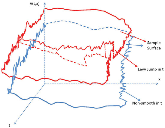 The solution of the FB-SPDE in Equation (8) can be interpreted in a sample surface manner with a time–position parameter (for example, can be roughly illustrated in Figure 1). Note that, the sample surfaces may involve jumps in a time parameter t since the system is driven by the Lévy type of noises.