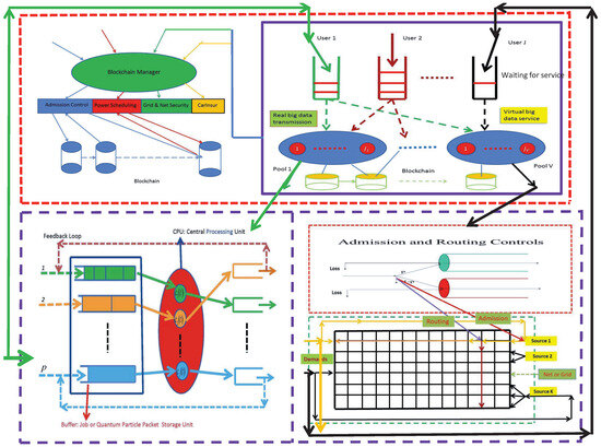 In this example, two real-world physical queuing systems aided with quantum-cloud computing service centers are presented. The first one in the left-lower part of Figure 2 is with p-job classes, and it can be considered as a multi-input multi-output (MIMO) wireless channel presented in Dai [3,8]. The focus of this case is on how to allocate the common shared transmission rate capacity to different users fairly in a non-zero-sum game manner. The second one in the right-lower part of Figure 2 is also with p-job classes and it typically represents a power-energy grid. In this case, the users are competing with each other in order to gain access into the grid via admission control while establishing the best routing path in a BestGo way (i.e., in a zero-sum game manner). The quantum-cloud computing service centers in the right-upper part of Figure 2 are with J-job classes. They are equipped with blockchain software architecture for the purpose of system security and management as studied in Dai [8]. Note that both the physical systems and the quantum-cloud centers can be studied as independent queuing systems. For the purpose of the current paper, we use the physical queuing systems as illustrative examples.