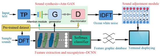 With the generation of ocean white noise as its core part, the system construction process is shown in Figure 2. Firstly, the Discrete Fourier Transform (DFT) module is used to convert the white noise from sound signals into spectrograms that DCNN can process. Then, the DCNN is used to extract features and recognize the spectrograms. The extracted feature will be input into a generated network (attn GAN) to generate spectrograms. By connecting a text processing (TP) and attention module to the generated network, the system can randomly generate a white noise spectrogram of the corresponding category based on the prompt text input by the user. Moreover, the Inverse Discrete Fourier Transform (IDFT) module will convert the spectrogram to sound signals. Simultaneously, corresponding feature graphics will be called from the dynamic graphics database according to the sound recognition results displayed on the system terminal along with the ocean white noise. The following text will expand on the specific generation method of ocean white noise and dynamic graphics.