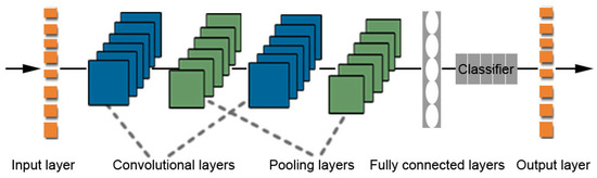The Deep Convolutional Neural Network (DCNN) extracts features from the spectrogram. It is a well-known network model for image recognition and feature extraction, which includes the input layer, convolutional layers, pooling layers, fully connected layers, and output layer [26], as shown in Figure 3.