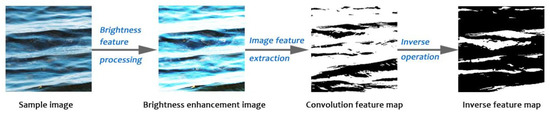 We meticulously collect a certain number (20) of natural images for each type of white noise to create a dynamic graphics library. The convolution operation with precision is then applied to extract the image features of natural scenery images, and the specific method refers to the extraction method of spectrogram features in Section 2.1. Taking a sample image of a sea wave, for example, the image brightness feature is enhanced by brightness feature enhancement and threshold processing, and then the convolution operation (mentioned above) is applied to obtain its feature map. An inverse operation is sometimes applied to the feature map to highlight its essential parts. Figure 4 shows the image feature processing and extraction process.