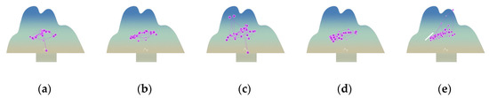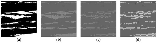 Based on the feature or inverse feature maps from sample images, feature graphics are created by using feature point sampling and connecting. Taking the sample image of sea waves, for example, it takes feature point sampling to its inverse feature map with the image size of 224 × 224, as shown in Figure 5a. When the sampling steps in the X and Y directions are both set as three pixels, it obtains the feature point map, as shown in Figure 5b. It optimizes the feature point sampling map by resetting the sampling step in the Y direction to two times, as shown in Figure 5c, which reflects the features of waves more lively and clearly. By connecting the feature points with a limited condition that the distance between two points is lower than a specific value (six pixels in this method), the line graphic is obtained, which simulates the wave shape in nature, as shown in Figure 5d. By this method, a straightforward feature graphic map is obtained after removing the discrete points or line segments with a proper threshold.