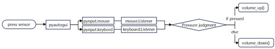 The stimulus material used in this experiment is the ‘dynamic graphic in white noise’ from the former experiment. To ensure the stability of experimental conditions, we use the same type of white noise and its dynamic graphic generated by the system for all the participants, such as ‘whale’. By connecting the tactile sensor to the sound adjustment module, which is a component that interprets the tactile pressure into sound intensity changes, users can change the sound intensity of white noise by tactile pressure. A human–computer interaction algorithm is applied to achieve the offline variation pattern from touch to sound. The implementation method can be described as follows: The pressure sensor connected to the system detects the user’s pressing operation, including the force and duration of the pressing, which determines the amplitude and speed of volume adjustment. Different volume adjustment strategies can be set based on the detected pressure information. Thus, the increase or decrease in volume can be controlled by the user’s pressing on the sensor with a preset threshold. The specific algorithm implemented using Python tools is shown in Figure 9.