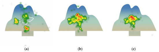 The hot spot map under different audiovisual environments. (a) Static graphic in white noise; (b) dynamic graphic in white noise; (c) dynamic graphic in silence.