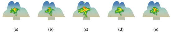 User viewpoint tracking map at different sound intensity levels: (a) at 30 dB; (b) at 40 dB; (c) at 50 dB; (d) at 60 dB; (e) at 70 dB.