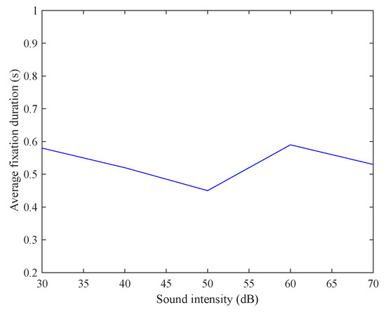 - It presents a fluctuating influence law from white noise sound intensity to visual concentration, which is reflected by average fixation duration and average saccade count parameters. It considers that the user’s visual concentration improves when the average fixation duration increases and the average saccade count decreases. During the experiment, the average fixation duration fluctuated with the increase in sound intensity, and the average fixation time reached the minimum value when the sound intensity was about 50 dB, as shown in Figure 14. Simultaneously, the saccade count had a more noticeable change with the increase in sound intensity, and the average fixation time reached the maximum value when the sound intensity was about 50 dB, as shown in Figure 15. Combined with the viewpoint tracking maps in Figure 12, it indicates that user visual concentration is relatively low at the sound intensity level of about 50 dB and relatively high at about 60 dB.