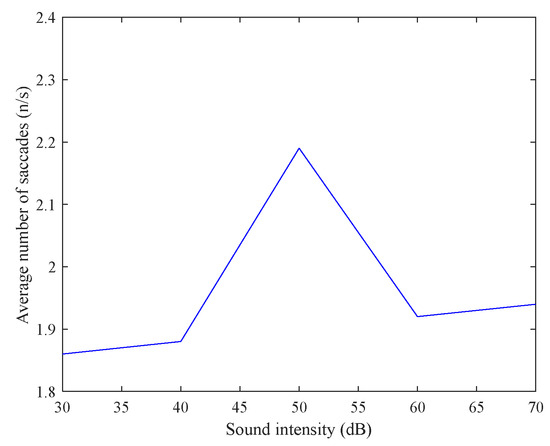 Figure 15. Saccade influence. - It presents a curvilinear influence law from white noise sound intensity to visual psychology. The pupil diameter often reflects the level of user visual psychological pressure and visual stimulation tension. In the sound intensity testing experiment, the average pupil diameter showed a curvilinear upward trend with the increase in sound intensity, indicating that the degree of tension in user visual psychology gradually increased. When the sound intensity increases to over 60 dB, there is still a curvilinear upward trend with the average and the maximum pupil diameter. However, the minimum pupil diameter decreases significantly, as shown in Figure 16. It indicates that it causes a significant change in user visual psychology when the white noise sound increases to over 60 dB.
