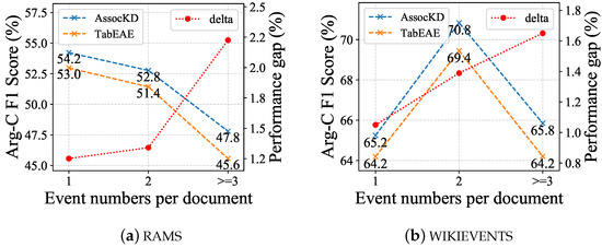 Furthermore, by comparing the performance gaps (red dashed line) between the two methods, we find that our performance improvement also becomes larger as the number of events increases compared to TabEAE. This further validates the effectiveness of our AssocKD approach in leveraging inter-event association to enhance argument extraction models.
