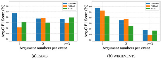 Similarly, to assess the model’s ability to model intra-event argument association, we measure the performance of AssocKD on events varying with argument number, as depicted in Figure 5. It can be observed that our proposed AssocKD method generally outperforms the current state-of-the-art methods TabEAE and PAIE, which are designed for multi-event and single-event argument extraction, respectively, in terms of performance on the RAMS and WIKIEVENTS datasets. Moreover, as the number of arguments within an event increases, the model’s F1 score only experiences a relatively small decline, indicating that explicitly modeling the intra-event argument association benefits argument extraction.