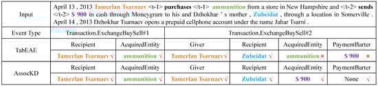 In this section, we present a case study from the WIKIEVENTS test set. As shown in Figure 6, the document contains two events triggered by “purchases ” and “sends” respectively, both of type “Transaction.ExchangeBuySell”. Specifically, TabEAE fails to recognize that the shared argument “Tamerlan Tsarnaev” identified in event #1, is also an argument of event #2. However, our proposed AssocKD method, capable of establishing an argument association between the two events, handles this problem effectively. Additionally, for event #1, TabEAE incorrectly identifies the argument “$900” as the argument of role “AcquiredEntity”, resulting in the absence of it for the role “PaymentBarter”. In contrast, our AssocKD correctly identifies and classifies all arguments for event #2, indicating the significance of modeling intra-event argument association.