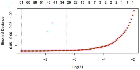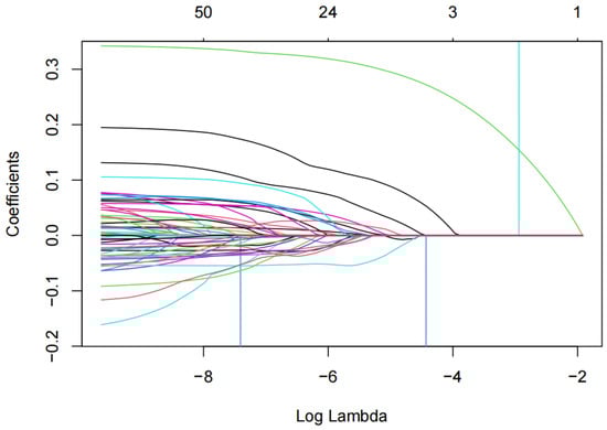 Logistic regression is a prevalent method in credit scoring. For datasets containing many digital footprint variables, indiscriminate data collection can complicate variable and model selection. As technology advances and data volumes increase, flexible methods like lasso are essential in personal credit scoring to identify key variables, minimize redundancy, and improve prediction accuracy and robustness []. Therefore, we first use lasso logistic regression for variable selection.