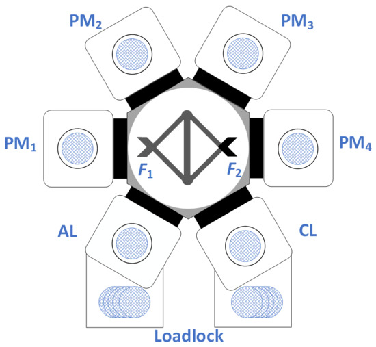 As a kind of complex wafer fabrication system that integrates various fabrication processes and robot operations in semiconductor manufacturing, cluster tools are crucial. Optimizing the operation of cluster tools is essential for enhancing the overall performance and efficiency of semiconductor production lines [1,2]. As shown in Figure 1, cluster tools comprise several process modules (PMs), a single-arm or dual-arm robot, and two loadlocks (LLs) for cassette loading and unloading. Single-wafer processing technology is employed in PMs, allowing each PM to process only one wafer at a time. Typically, 25 wafers with the same recipe are held in a cassette [3]. The robot follows a predetermined recipe to deliver wafers from a cassette to PMs for processing. Once all the operations are finished, a wafer is returned to its original position in the cassette.