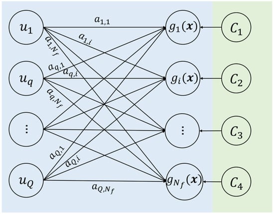 The structure of the MBSVR model is shown in Figure 1, where the left side is the SLFM structure and combines linear combination of implicit functions, according to which the variance between can be quantitatively described. The right side represents the trade-off parameters in the support vector machine; for each output, there is a corresponding trade-off parameter, which is used to trade off the complexity and error of the model. The output can be expressed as (27), where is the parameter to be optimized, is Gaussian process implicit function. Based on the expression of , the model can be expressed as: