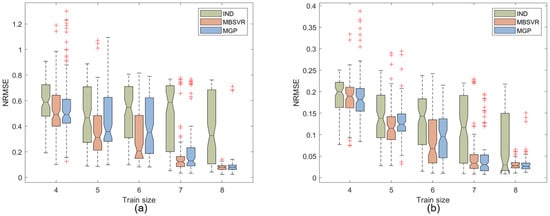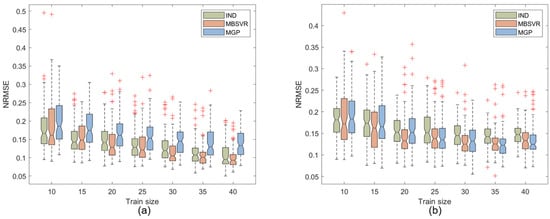 Figure 3 shows the modeling results for the two outputs of Forrester. The bottom and top of the boxplot indicate the lower and upper quartiles, respectively, while the center depression indicates the median of the metrics. The maximum length of the vertical line at the end of the boxplot is 1.5 times the interquartile spacing. A red plus sign indicates an outlier that is outside the boundaries of the vertical line. It can be seen that when the number of sample points is small (4), the three modeling methods are roughly equivalent. As the number of training sets increases, the two modeling methods MBSVR and MGP, which consider output correlation. This phenomenon may be due to the fact that when the number of samples is small, the current information cannot support the accurate solution of relevant parameters such as correlation. Moreover, MBSVR has the best results and the most significant advantage when the size of the training set is 5 or 6, after which the modeling results of MBSVR are gradually comparable to the modeling results of MGP. This may be related to the small-sample modeling capability of SVR.