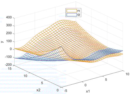 Next, a two-dimensional function Branin with two outputs is used to validate method validity. Output 2 is the original Branin function, and Output 1 is a fine-tuning of the original Branin with a linear translation added, as shown in Figure 4. These two outputs are also strongly correlated, with a Pearson correlation coefficient of 0.69.