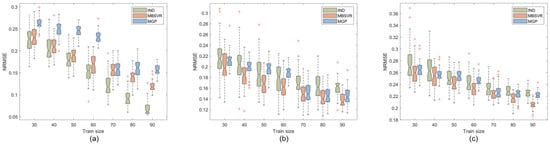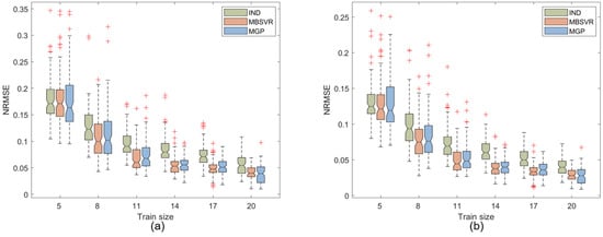 The single-response Bayesian support vector machine [] and a multi-output Gaussian process model [] are used for comparison with the multi-output Bayesian support vector machine model (MBSVR). The three methods are denoted by (independent regression) IND, (multi-output Gaussian process) MGP, and MBSVR, respectively. The lhsdesign function in MATLAB is used to generate the training set and test set, and for the model parameters, the kernel function parameter in MBSVR is initialized to 1, the trade-off parameter C is initialized to 1000, and the range of optimality search is and . The kernel function parameter of the multi-output Gaussian process is initialized to 1. In the multi-output Bayesian support vector machine, is initialized to a unit matrix. For the same hyperparameters in all three models, the same initial values and optimization ranges are assigned to allow for a fairer comparison.