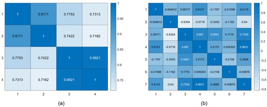 According to the results of the correlation analysis, the Pearson correlation coefficient of Energy_efficiency is greater than 0.97. The Pearson correlation coefficients of the four outputs of Polymer are large, as shown in Figure 6a, and there is a strong correlation between Output 1 and Output 2 as well as between Output 3 and Output 4. As for Broomcorn, the Pearson correlation coefficient of Output 1 and Output 2 is 0.39, the correlation coefficient of Output 1 and Output 3 is −0.67, and the correlation coefficient of Output 2 and Output 3 is −0.37. The results of the output correlation analysis of Sarcos are shown in Figure 6b. The correlation of Output 4 and Output 7 is the highest, and the correlation of Output 1 and Output 2 is the lowest. Output 6 has low correlation with all other outputs.