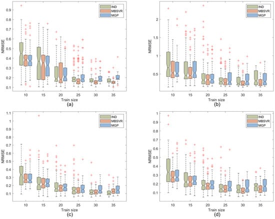 As the training size increases, the model accuracy advantage shows two different trends. In Output 1 and Output 4 for polymer and Output 2 and Output 3 for Broomcorn, the advantage of MBSVR over other modeling methods is more pronounced as the training size increases. However, there are also cases where the advantage of MBSVR is not obvious as the training size increases, e.g., in the Sacros dataset, the modeling accuracy of MBSVR gradually converges to the modeling accuracy of MGP as the training set increases. Theoretically, as the training set increases, the hyperparameter estimates should get closer and closer to the true values, and if the model assumptions are correct, the hyperparameter estimates are accurate, and the model accuracy improves as the training set increases.