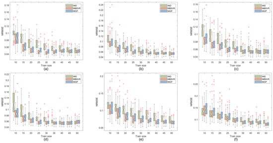 Modeling results for Sarcos (f1–f6): (a) results for Output 1; (b) results for Output 2. (c) Results for Output 3; (d) results for Output 4; (e) results for Output 5. (f) results for Output 6.
