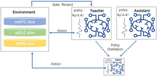 Generally, students typically receive guidance from a single teacher, and single-teacher policy distillation can also transfer the optimal policy to the student model, achieving satisfactory accuracy. However, if the teacher’s teaching style or method does not suit a particular student, that student may not achieve ideal learning outcomes. Some researchers have also suggested that learning from a single teacher may introduce inductive bias. That is, the teacher model may perform inadequately in certain environments due to reasons inherent to the model itself or insufficient training [5]. Based on this consideration, we introduce an assistant model in the RAN slicing environment as a supplement, proposing a dual-model policy distillation with both teacher and assistant models.