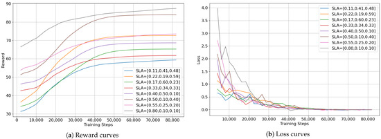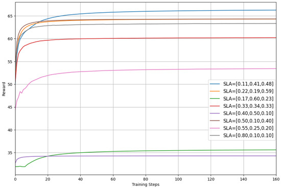 In our research, taking a specific weight configuration as an example, the weights for voice over LTE (VoLTE), ultra-reliable low-latency communication (uRLLC), and video are 0.3, 0.6, and 0.1, respectively. This weight configuration is represented as slice = [0.3, 0.6, 0.1] and is referred to as the SLA weight. The RL agent trained under this weight configuration can efficiently handle the corresponding service demands according to the SLA. However, when the slice weights change, for example, during the operation of MNOs, the SLAs may be adjusted based on the overall QoE of the network. The new SLA weights may be represented as slice_new = [0.8, 0.1, 0.1]. Hereafter, we will consistently use this method to represent the SLA weights of network slices.