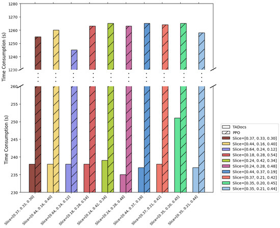We compared the training time for 10 student slice models between the PPO and the TADocs. When the SLA weights changed, the average time taken using the TADocs method was 238.82 s, while the average time taken using the PPO algorithm was 1253.12 s. This indicates that the TADocs method significantly reduced the time cost, decreasing the training time by approximately 81%, as shown in Figure 6.