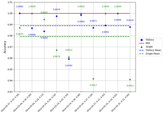 In terms of stability, the TADocs method also demonstrated significant advantages. As shown in Figure 7, the lowest accuracy achieved by single-teacher policy distillation was only 94.12%, whereas the TADocs method maintained an accuracy of 95.92% even in the most unfavorable conditions. Moreover, from the figure, we can see that the stability of the curves for the TADocs method is significantly better than that of the single-teacher to single-student policy distillation.